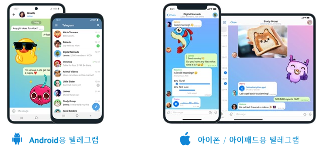 텔레그램은 안드로이드, iOS, Windows/Mac/Linux 등 다양한 디바이스와 플랫폼에서 편리하게 사용이 가능합니다.